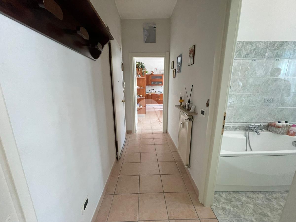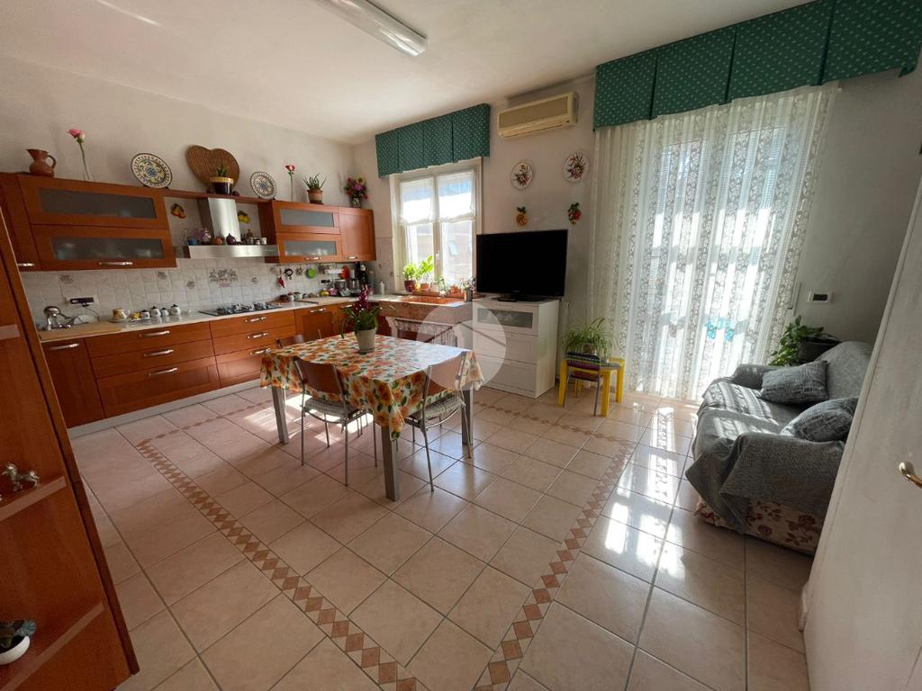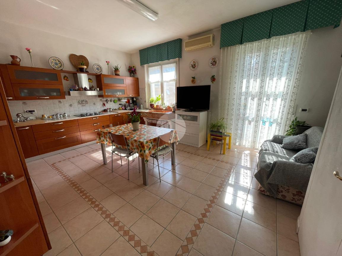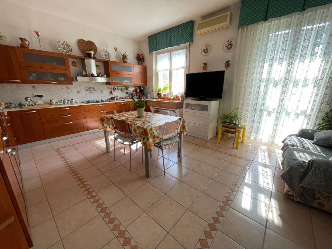 L'alloggio, posto al terzo ed ultimo piano senza ascensore, ha l'ingresso che si apre su un disimpegno che conduce alla zona giorno composta da un'ampia cucina abitabile con portafinestra che conduce al primo balcone, una sala e un bagno con vasca.
