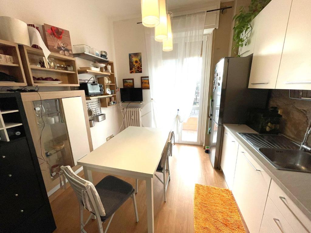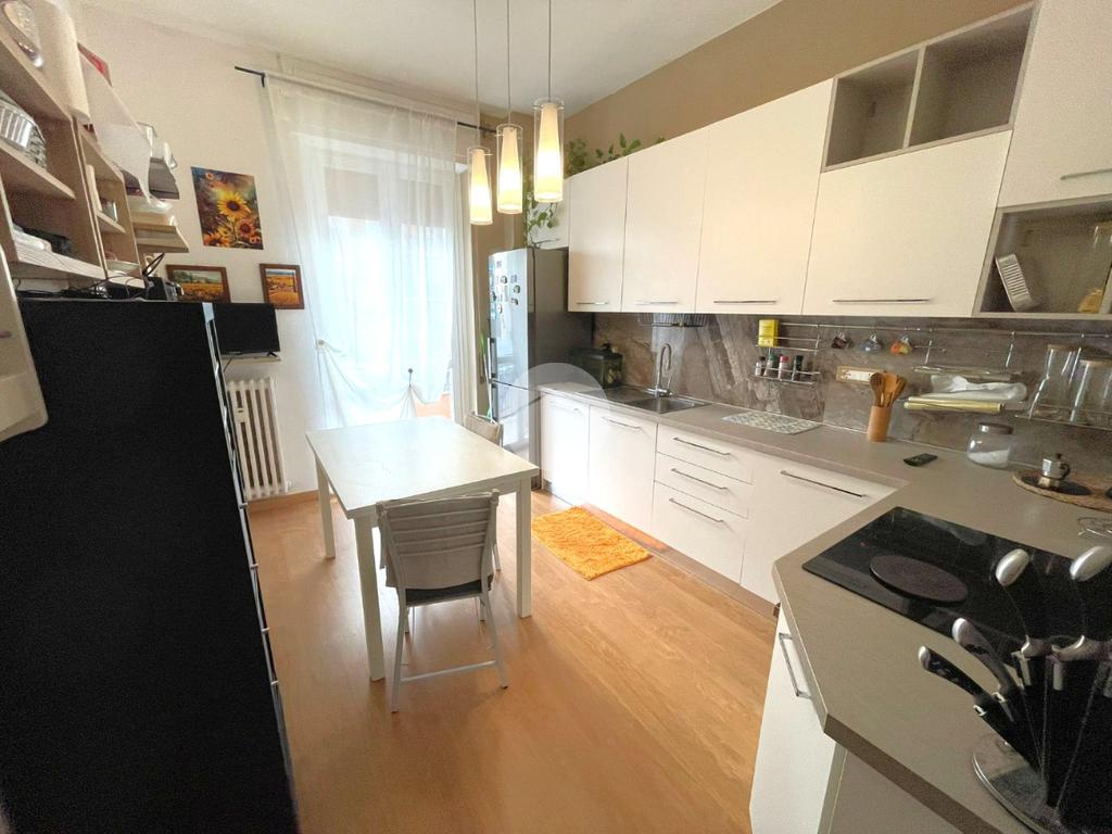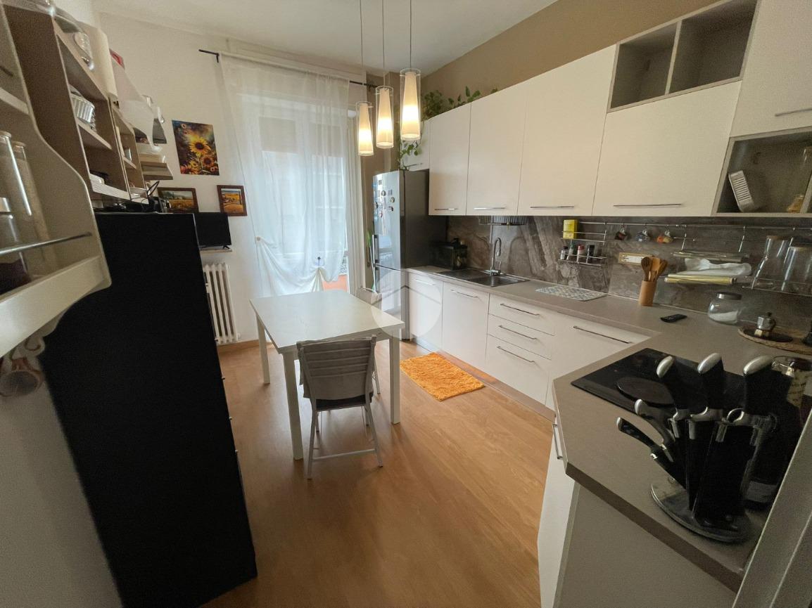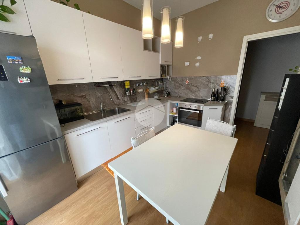 L'alloggio, posto al primo piano con ascensore, ha l'ingresso che si apre sulla zona giorno composta da ampio soggiorno e una cucina abitabile.
