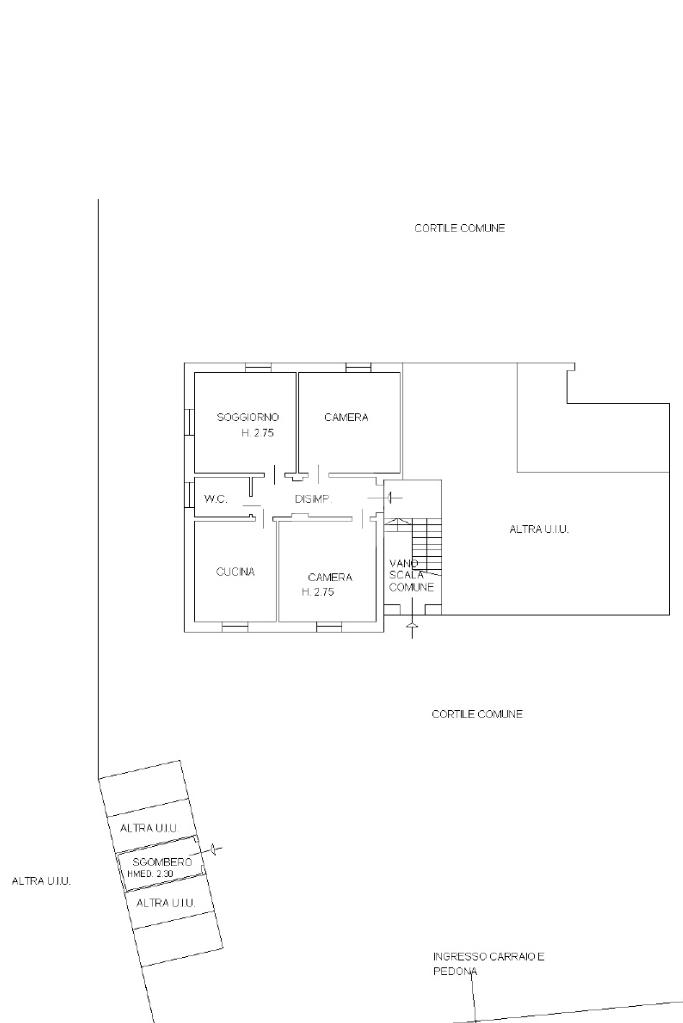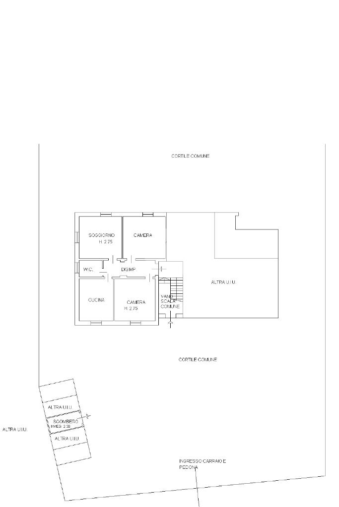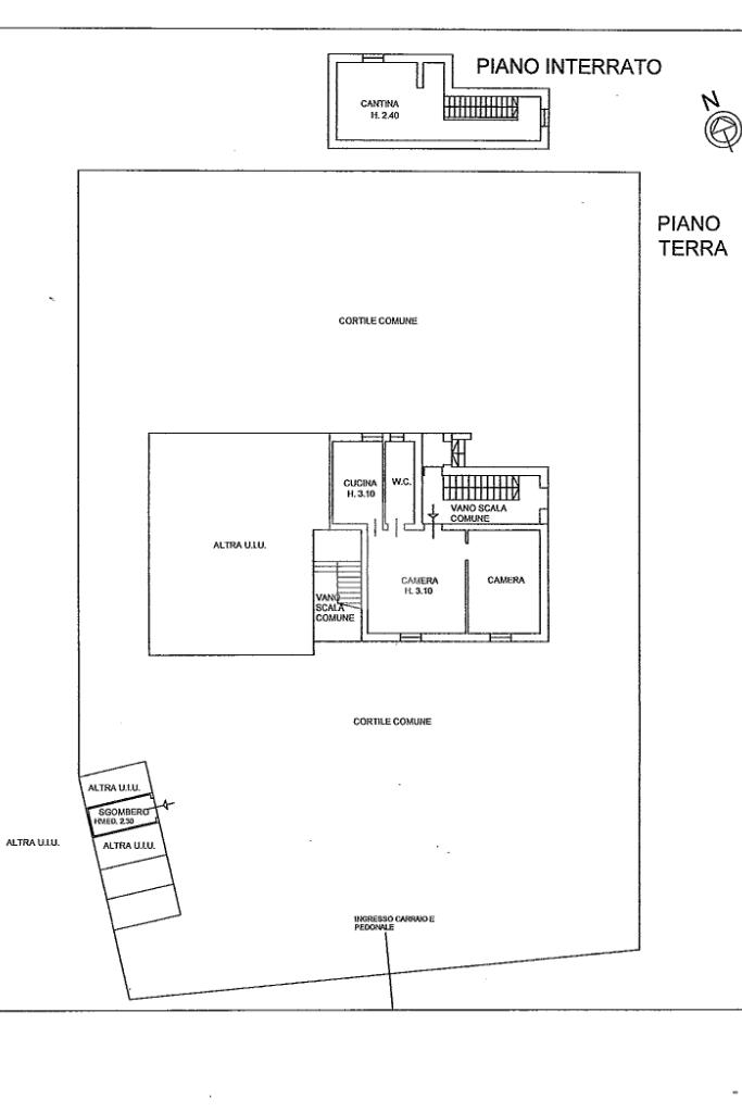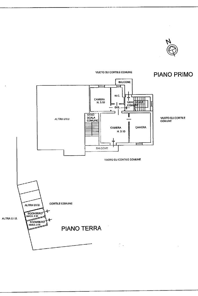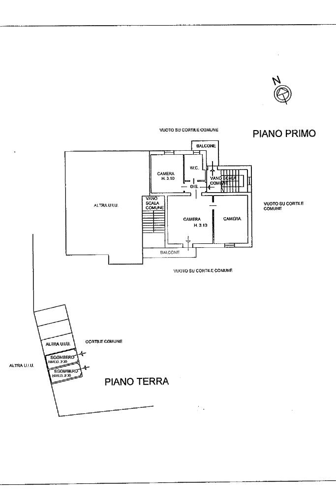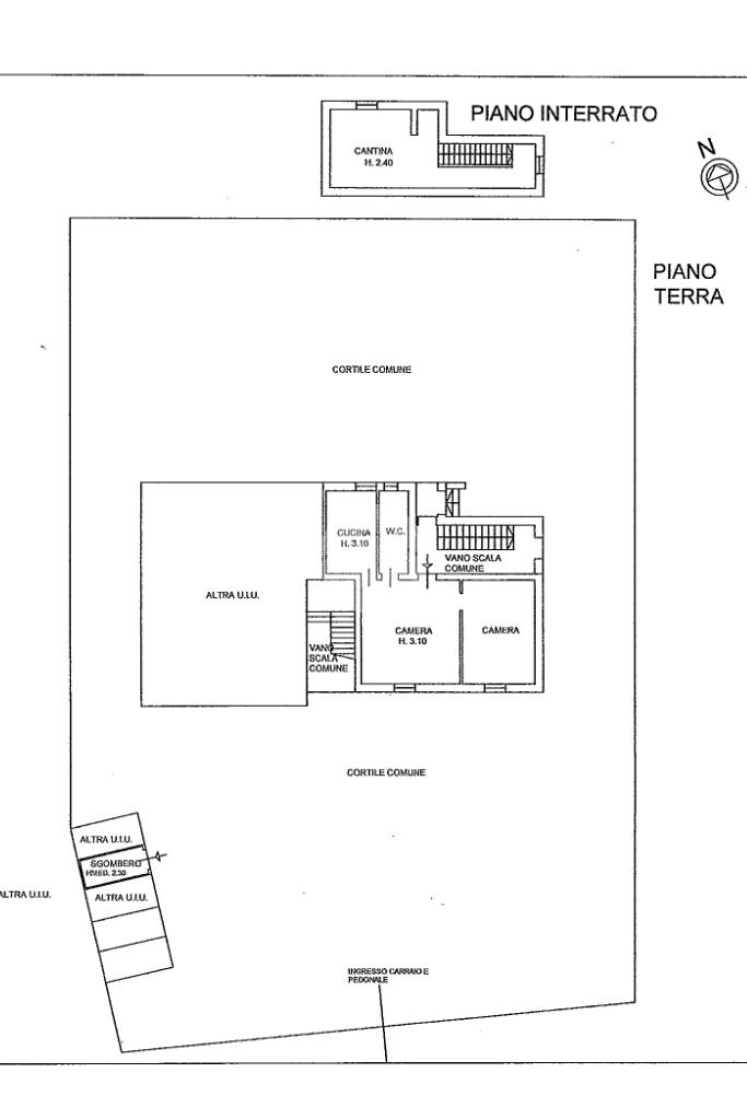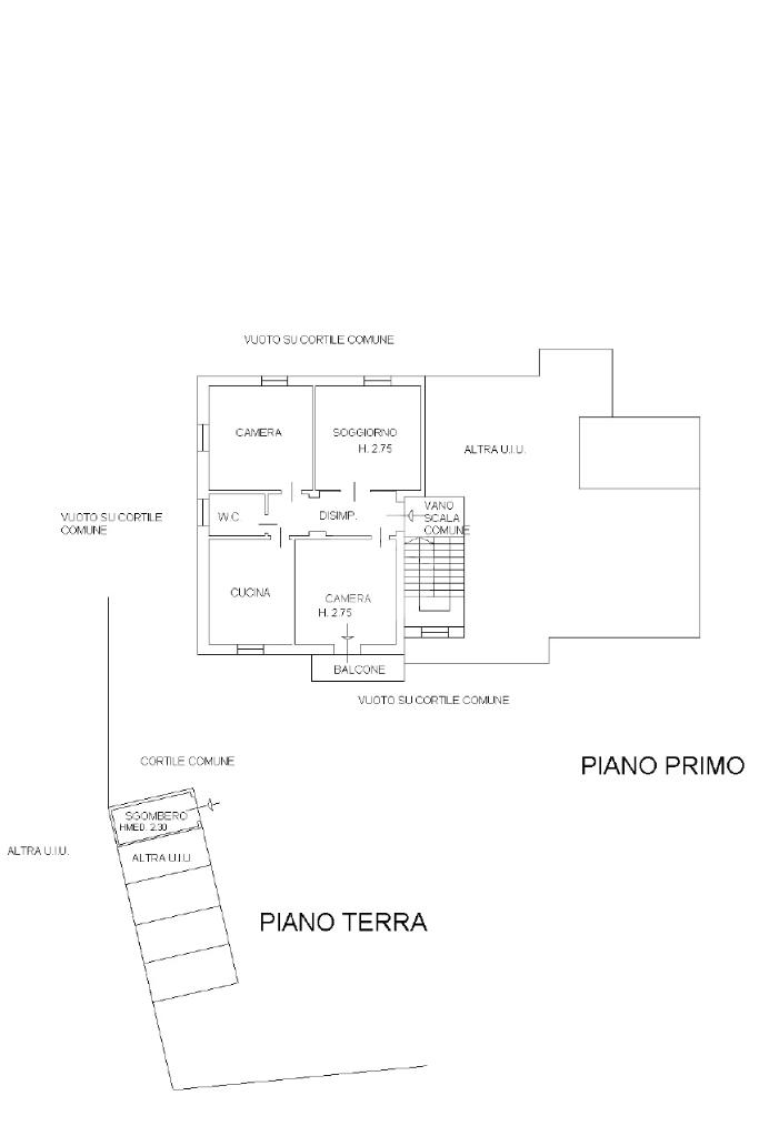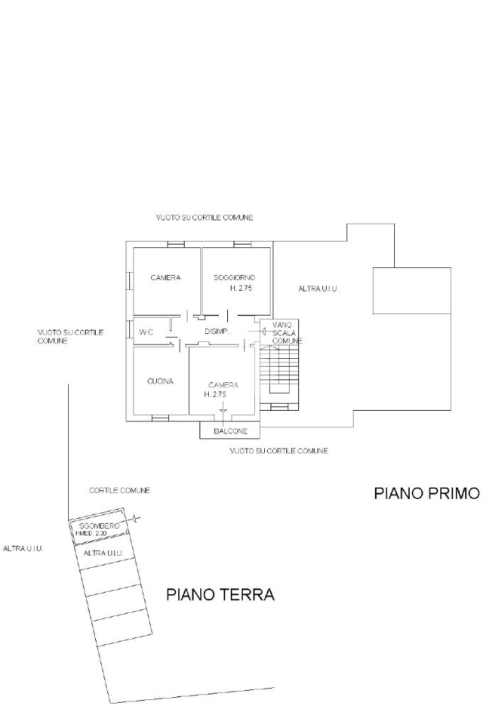 Accedendo dal primo ingresso troviamo due appartamenti uno al piano terra mentre l'altro al piano primo; l'alloggio al piano terra comprende una cucina abitabile, soggiorno, due camere da letto matrimoniali e bagno. L'alloggio al primo piano invece è composto da cucina abitabile, soggiorno, due camere da letto matrimoniali, bagno e balcone.